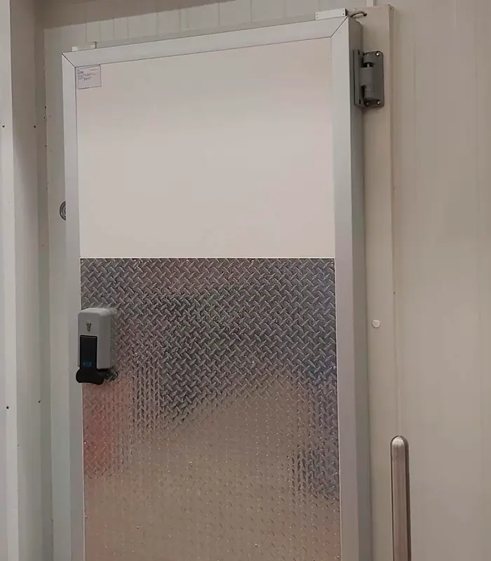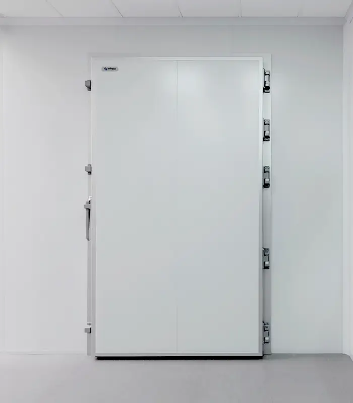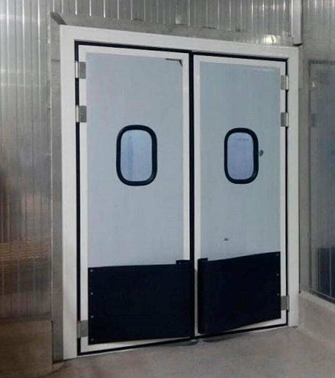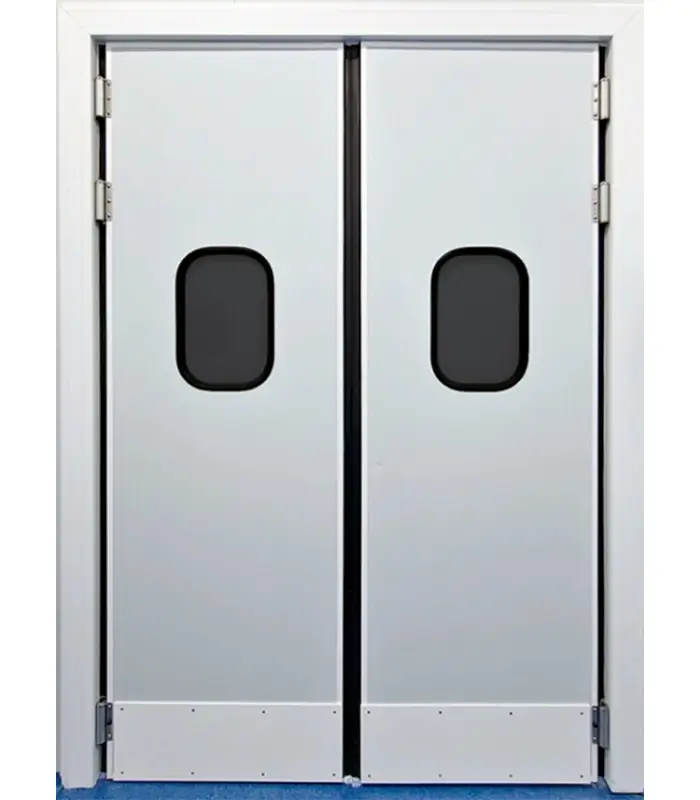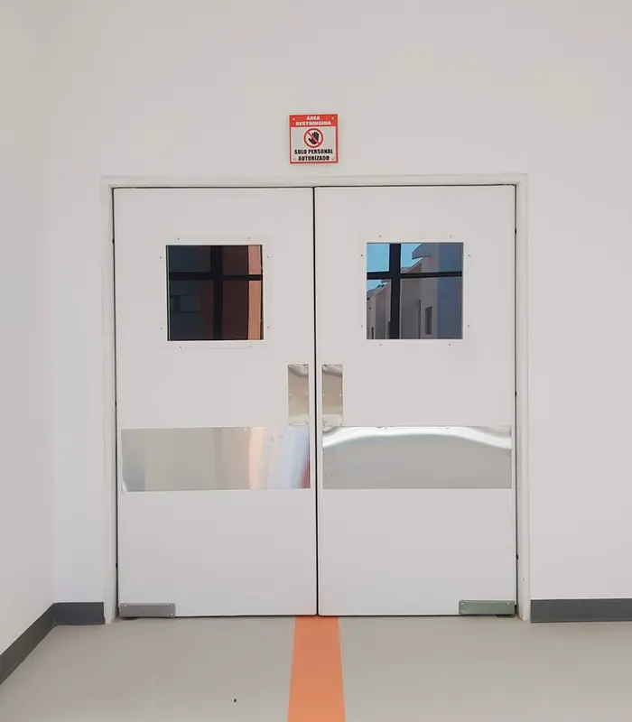 polyester lavable, color a escoger, refuerzos internos para bisagras de 4″, preparación para haladera y cerradura de manija G-2. puerta bajo normas NSF, ANSI y NFPA Diseño higiénico acorde con la normativa ISO 14644-1 Con sistema Vaiven Kick plate Incluye: dos placas de acero inoxidable.