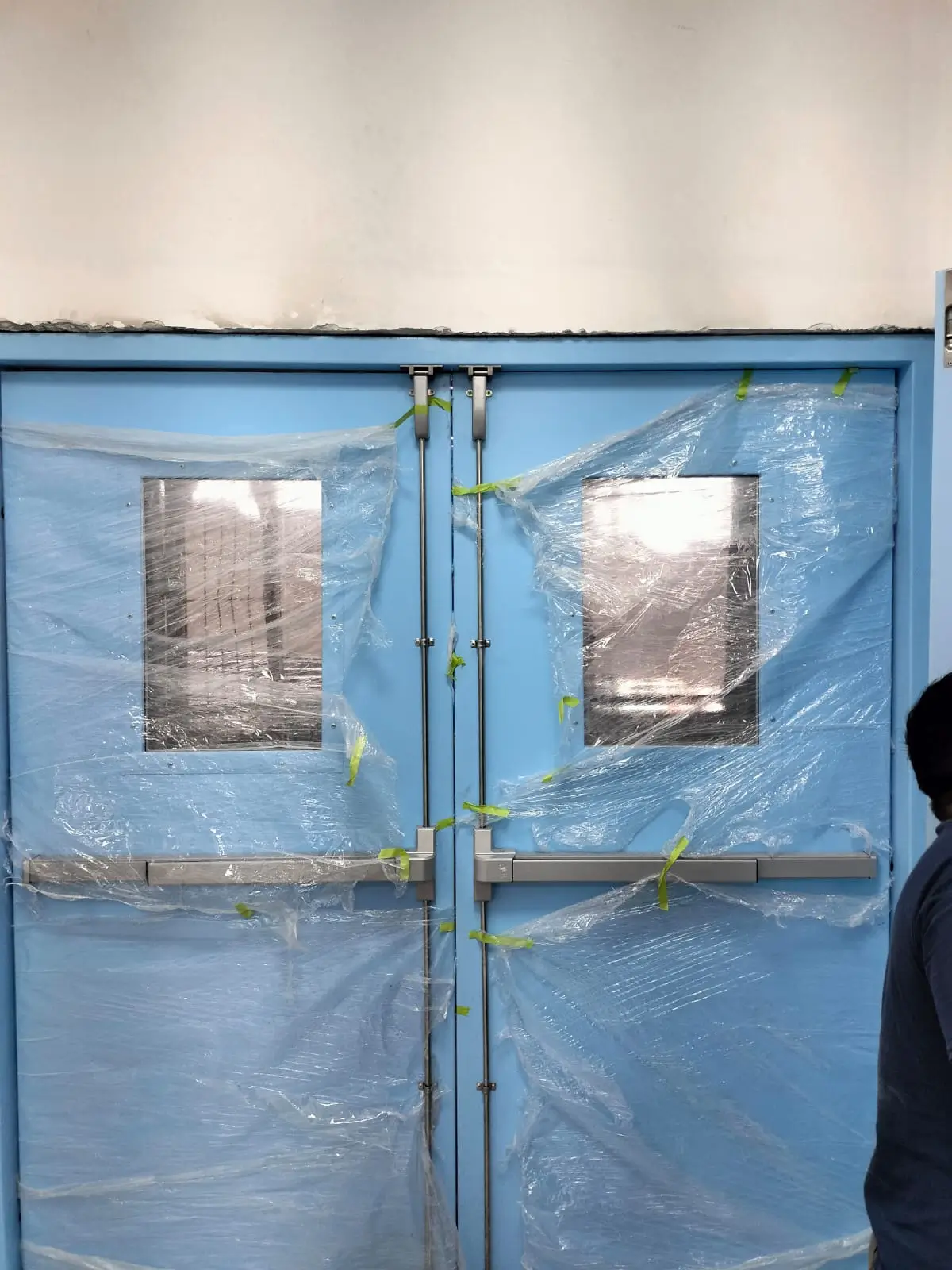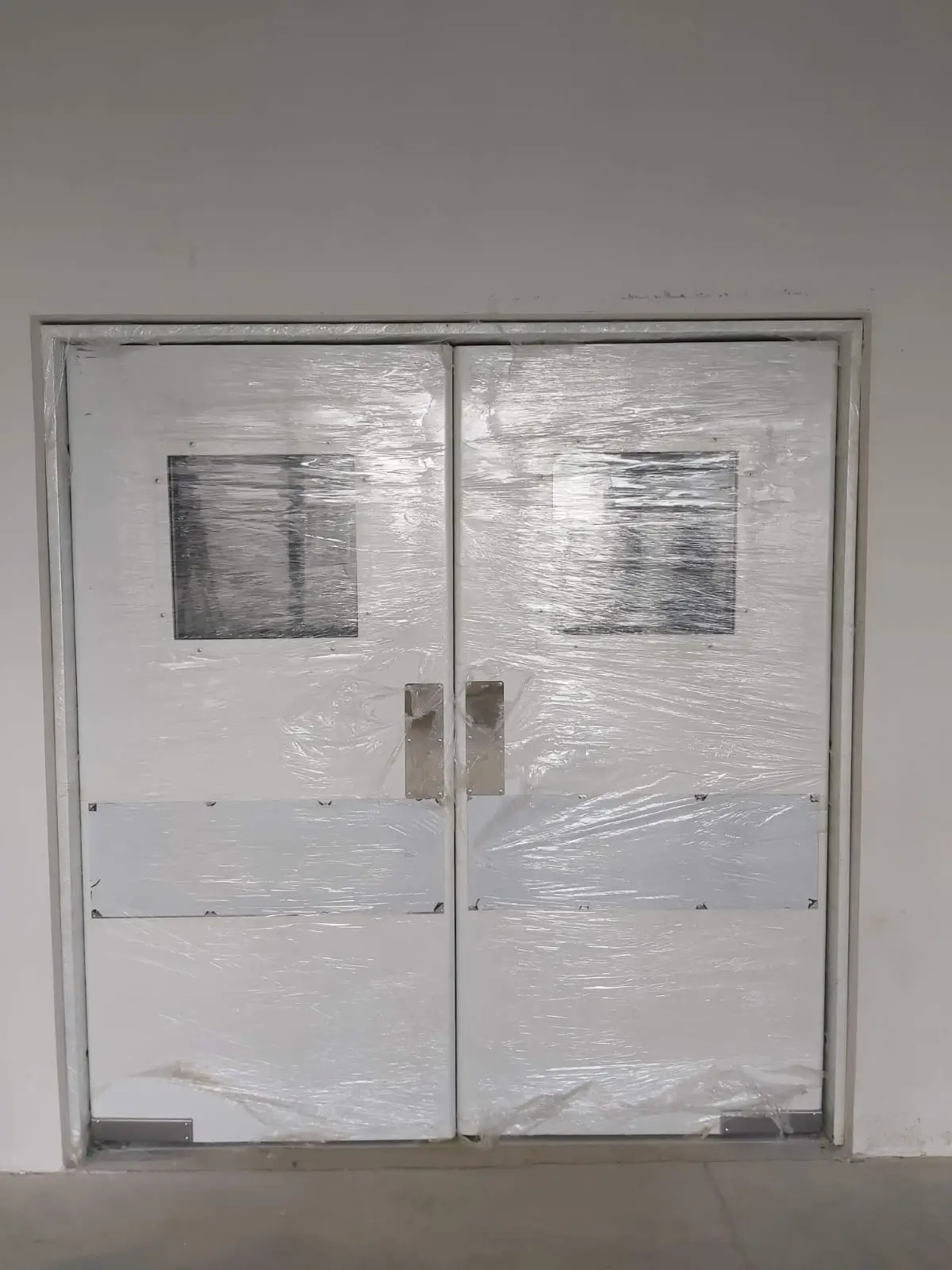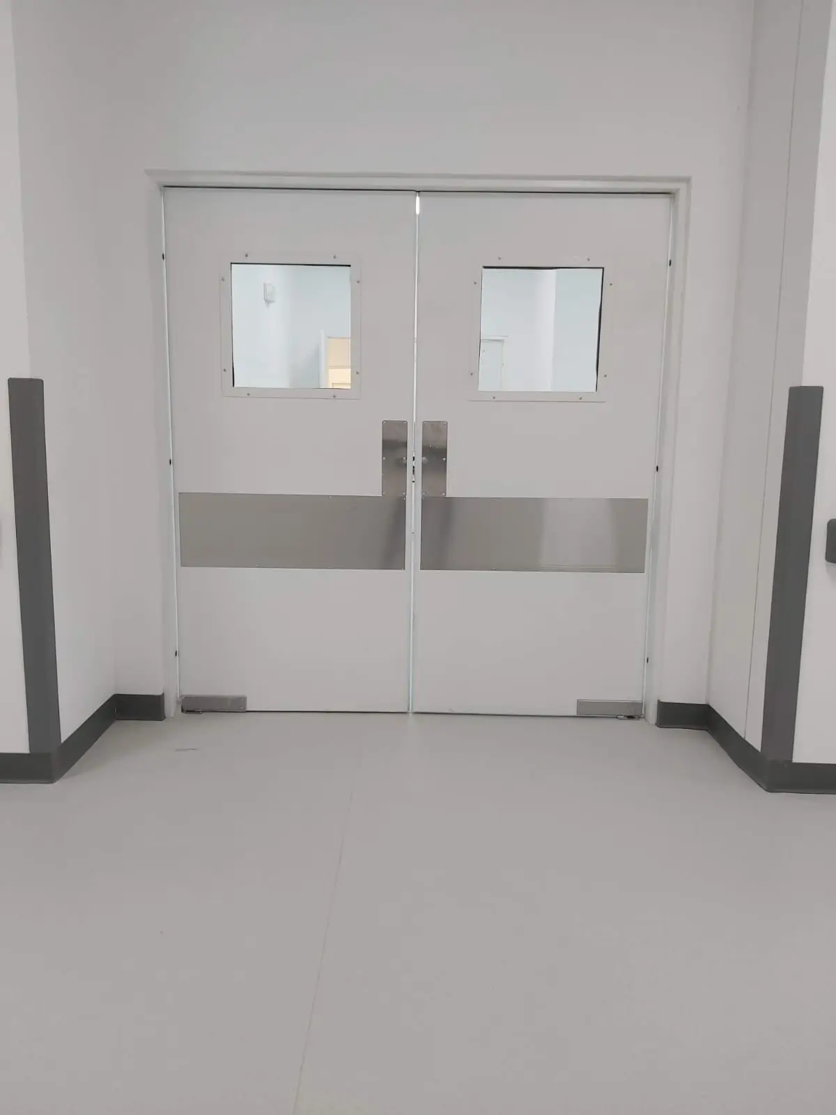 polyester lavable, color a escoger, refuerzos internos para bisagras de 4″, preparación para haladera y cerradura de manija G-2. puerta bajo normas NSF, ANSI y NFPA Diseño higiénico acorde con la normativa ISO 14644-1 Con sistema Vaiven Kick plate Incluye: dos placas de acero inoxidable.